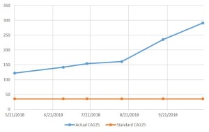 When I last left you in April mom had just had a scan and it was clear minus some lymph nodes and she was starting a new PARP inhibitor drug. Since then her CA125 had continued to go up (see chart below) while on the new drug. However, her CT scan in August was clear.